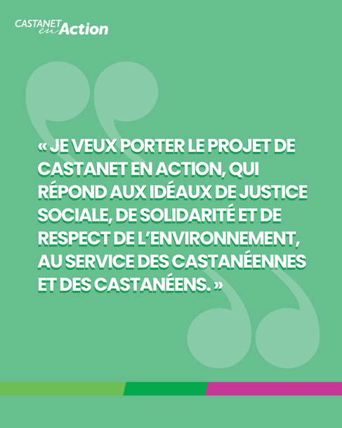 🌿 Il rejoint Castanet en Action pour porter un projet qui répond aux idéaux de justice sociale, solidarité et respect de l’environnement, couvrant tous les domaines municipaux : déplacements, logement, emploi, cadre de vie, école, culture, sport, seniors, solidarités, handicap.